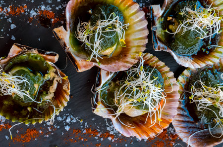 grilled scallops with coriander and green sauce on stone plate, seafood