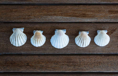 Inline pattern of sea shells on a wooden background. Top view