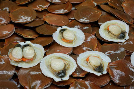 Fresh Pilgrim scallops or Pecten jacobaeus shell in market