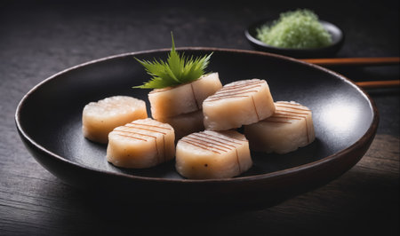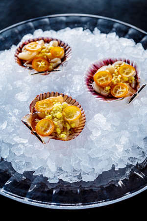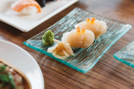Scallops sashimi from above. Fresh raw scallops sashimi dish. Sashimi is a Japanese cuisine delicacy consisting of sliced raw meat (usually fish and seafood) often served in sushi restaurants.