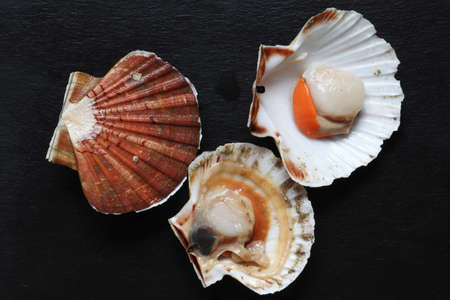 Photograph of three scallops one of which is closed, the other is open and the last is prepared on a slate for food illustrations