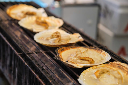 Close up of grill scallops selling at market in Osaka, Japan. Street food and travel concepts.