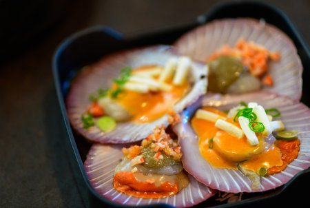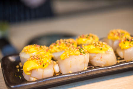 Scallops with Spicy Cheese Sauce.Premium Japanese Buffet concept