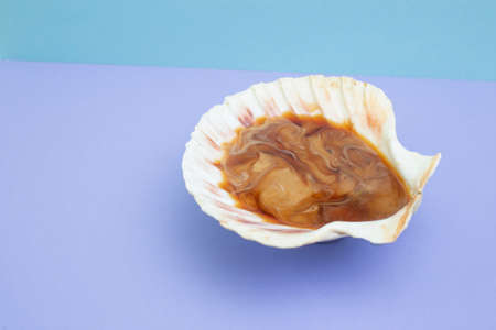 Coffee and milk in a sea shell, isolated on blue background.