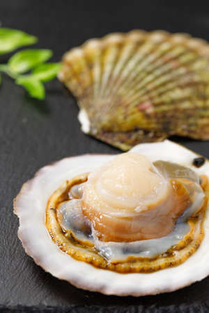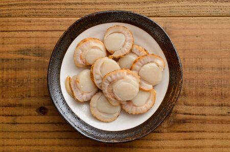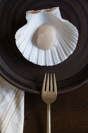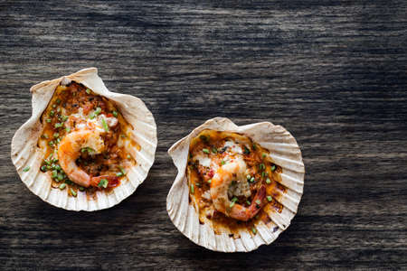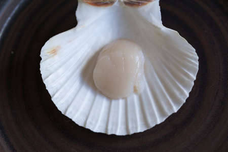 Delicious sea scallop served on a scallop shell on wooden background