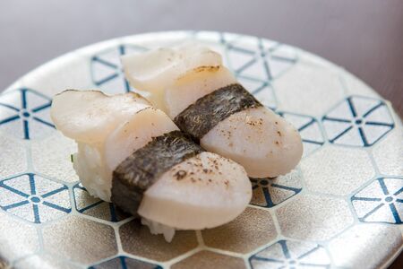 Sashimi sushi set with scallop on shell with daikon and lemon on plate on dark background