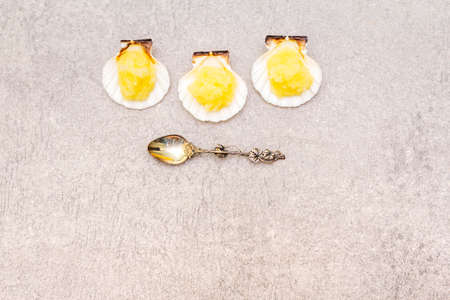 Capelin roe in seashells. Lightly salted caviar snack with silver spoon on a stone background, top view.
