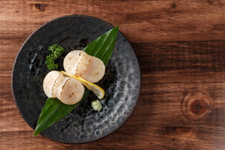 Top View of Grilled Scallops Served with Lemon and Wasabi with copy space for your text.