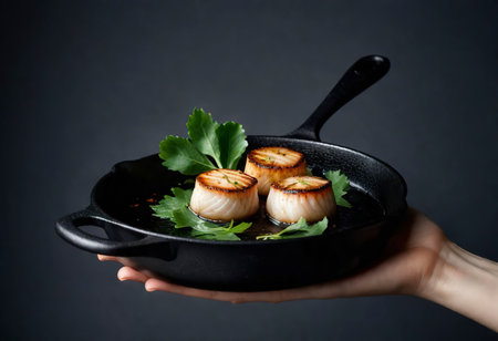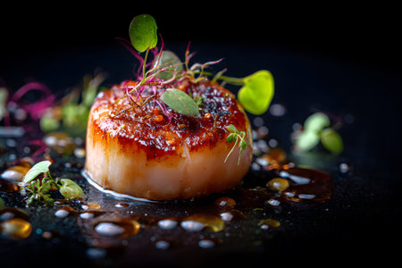 A beautifully seared scallop rests on a dark plate, adorned with fresh herbs and sauce. This dish highlights the creativity of gourmet cooking in a fine dining setting.