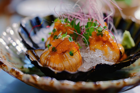 A close-up shot of a beautifully arranged variety of food dishes placed on a table, Expensive sea urchin uni sashimi served in a half shell, AI Generated