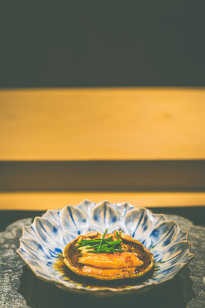 Scallops sea shell grilled leek with sauce teriyaki in Japanese style