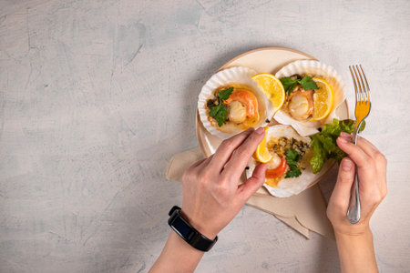 Baked scallops with caviar in a white plate on a white stone background. Female hands hold fork and squeeze lemon on the scallops. Dinner with seafood. View from above
