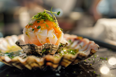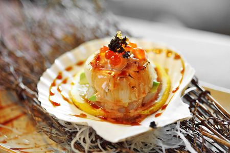 Raw scallop on a fan-shaped shell, served in a Japanese restaurant