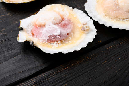 Shellfish, Frozen raw fresh scallops set, on black wooden table background, with copy space for text