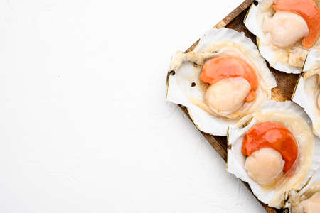 Fresh french scallops seafood market set, on white stone table background, top view flat lay, with copy space for text