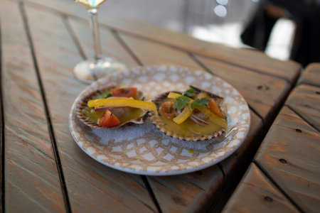 Two scallops on a decorative plate with garnish.. Málaga, Spain, tomato