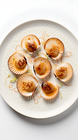 Grilled scallops on white plate isolated on white background.