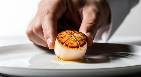 A close-up shot shows a chefs hand carefully placing a golden-brown seared scallop onto a clean white plate, ready for serving.