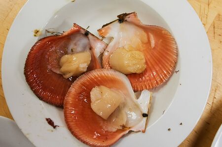 Scallop shell with scallops on a wooden table.