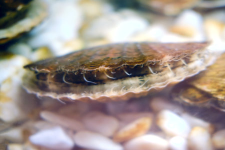 Macro shot of a scallop shell partially buried in sand. Underwater marine life and ocean habitat concept. Design for background, poster, wallpaper.