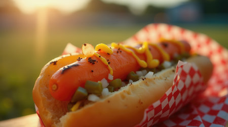 A close-up view of a grilled hot dog nestled in a bun with mustard, onions, and relish, set against a warm sunset in a summer barbecue atmosphere.