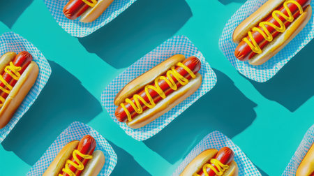 Classic American hot dogs topped with mustard arranged in a bold overhead layout on a vibrant blue background, great for street food, summer, or picnic visuals