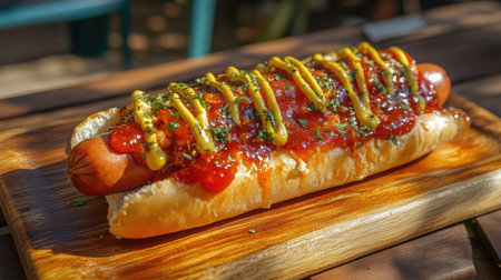 A delectable hot dog topped with mustard and ketchup is showcased on a wooden board. The warm sunlight enhances the vibrant colors, inviting a delightful summer feeling.