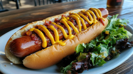 A mouthwatering hot dog topped with mustard and chili, served on a soft bun alongside fresh salad. Perfect for a casual dining experience or outdoor picnic.