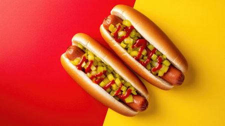 Enjoy a vibrant image of two tasty hot dogs topped with mustard, ketchup, and relish. Perfect for summer gatherings and food promotions.