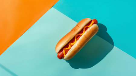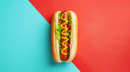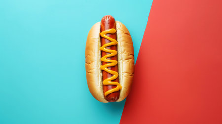 Delicious aesthetic hot dog in bun with mustard, copy space. Split blue and red background. Street food. Generative AI