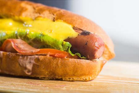 Hot dog with mustard, ketchup and mayonnaise on wooden board