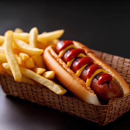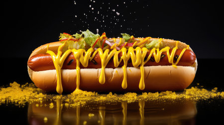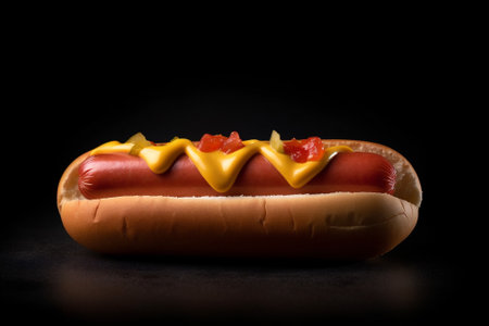 Hot dog with mustard and ketchup on a black background. AI generated