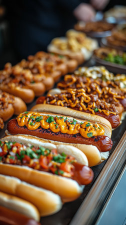 A diverse selection of gourmet hot dogs sits enticingly on a tray, showing colorful toppings and garnishes. The atmosphere is lively, typical of a food festival setting.