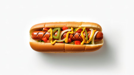 Hot dog on white background, top view. American fast food.