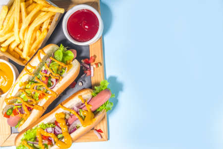 Barbecue grilled fastfood, Various traditional american hot dogs set with sausage, yellow mustard, ketchup and fresh vegetables salad, top view on bright blue background with french fries