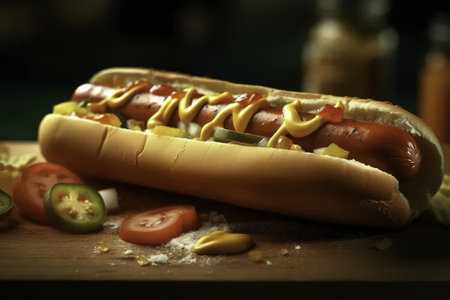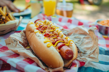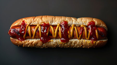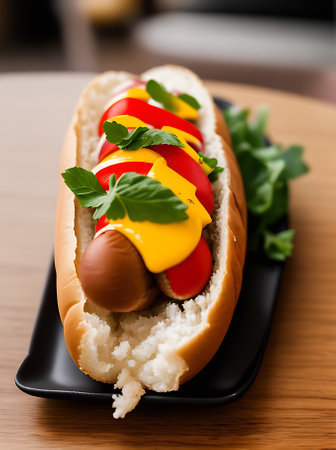A delicious and mouthwatering hot dog that is generously topped with both mustard and ketchup, ideal for summer picnics. Generative AI
