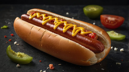 Enjoy a delicious hot dog, generously topped with tangy mustard and crunchy pickles, ideal for summer picnics. Generative AI