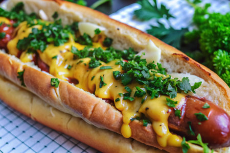 A hot dog with cheese and parsley on top. The hot dog is on a bun and is sitting on a plate