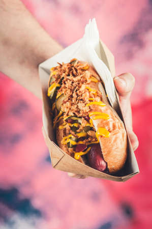 Street food hot dog with various toppings.