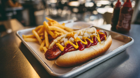 A mouth-watering hot dog adorned with ketchup, mustard, and onions, served alongside crispy golden fries, perfect for any casual meal.