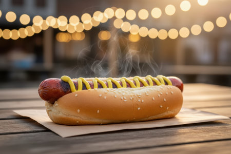 Steaming hot dog with mustard on a bun on a wooden table with bokeh lights.