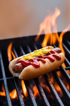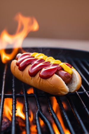 AI Generated. A sizzling hot dog smothered in ketchup and mustard atop a blazing grill