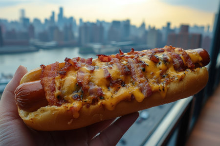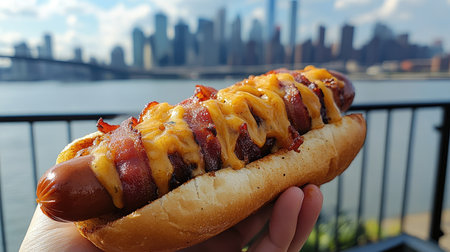 Hand holding a hot dog covered in cheese and bacon with the New York City skyline in the background