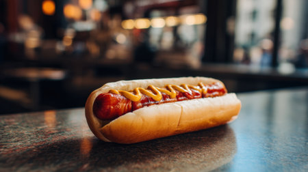 Delicious hot dog with mustard on a countertop in a cozy urban setting.