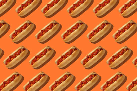 Delicious fast food for lunch in menu. Hot dogs with bun, sausage and red ketchup on orange background, seamless pattern, flat lay, wallpaper