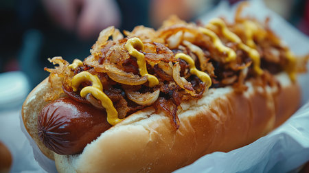 Close-up of a hotdog topped with fried onions and mustard, served from a Swedish street food stall, emphasizing its crisp and savory appeal.