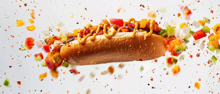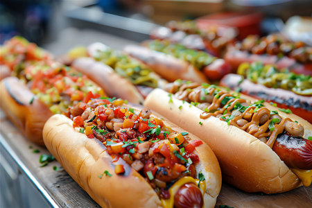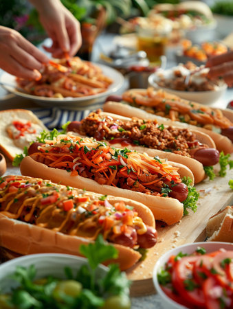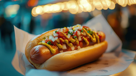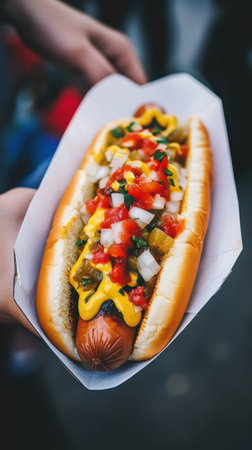 A mouth-watering hot dog showcasing vibrant toppings including colorful vegetables and condiments, perfect for warm outdoor gatherings and street food lovers.