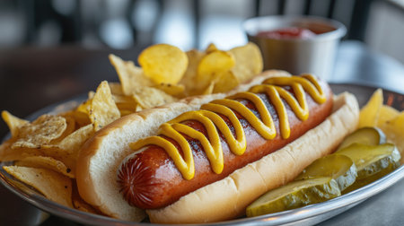 Classic American hot dogs served with mustard and ketchup, accompanied by a side of potato chips and pickles.