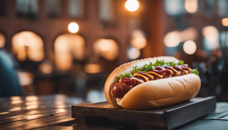 an american hot dog blurred restaurant in the background - Generative AI