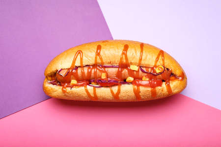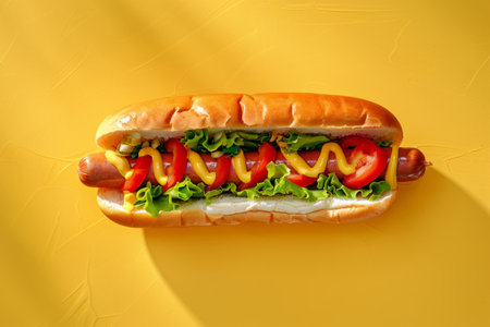 Delicious hot dog lying on vibrant yellow background